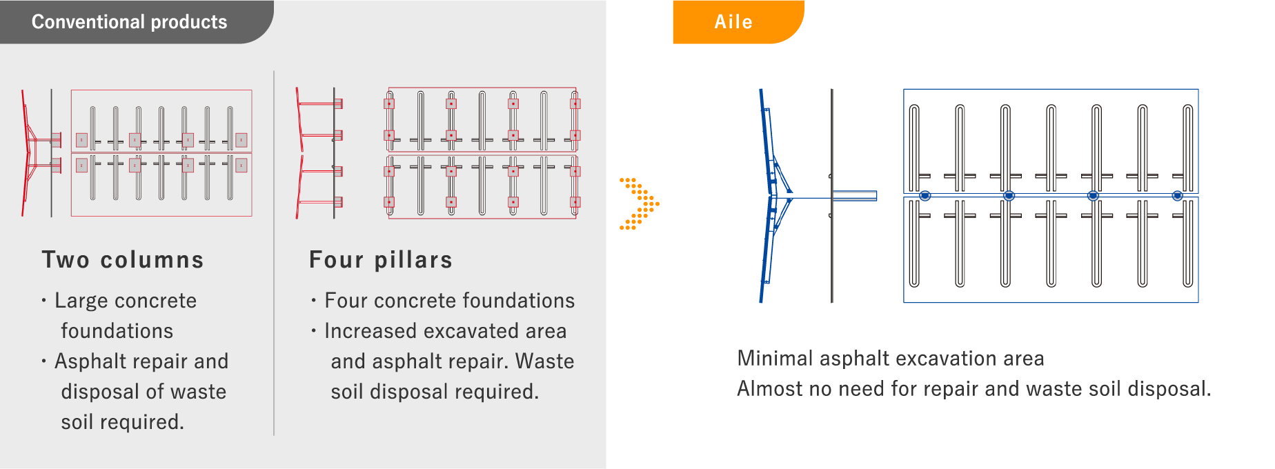 Compared with conventional front/rear two-post and rear two-post types, Aile is easier to install. It also reduces construction costs by minimising the total area of asphalt excavated and repaired and the amount of waste soil disposed of.